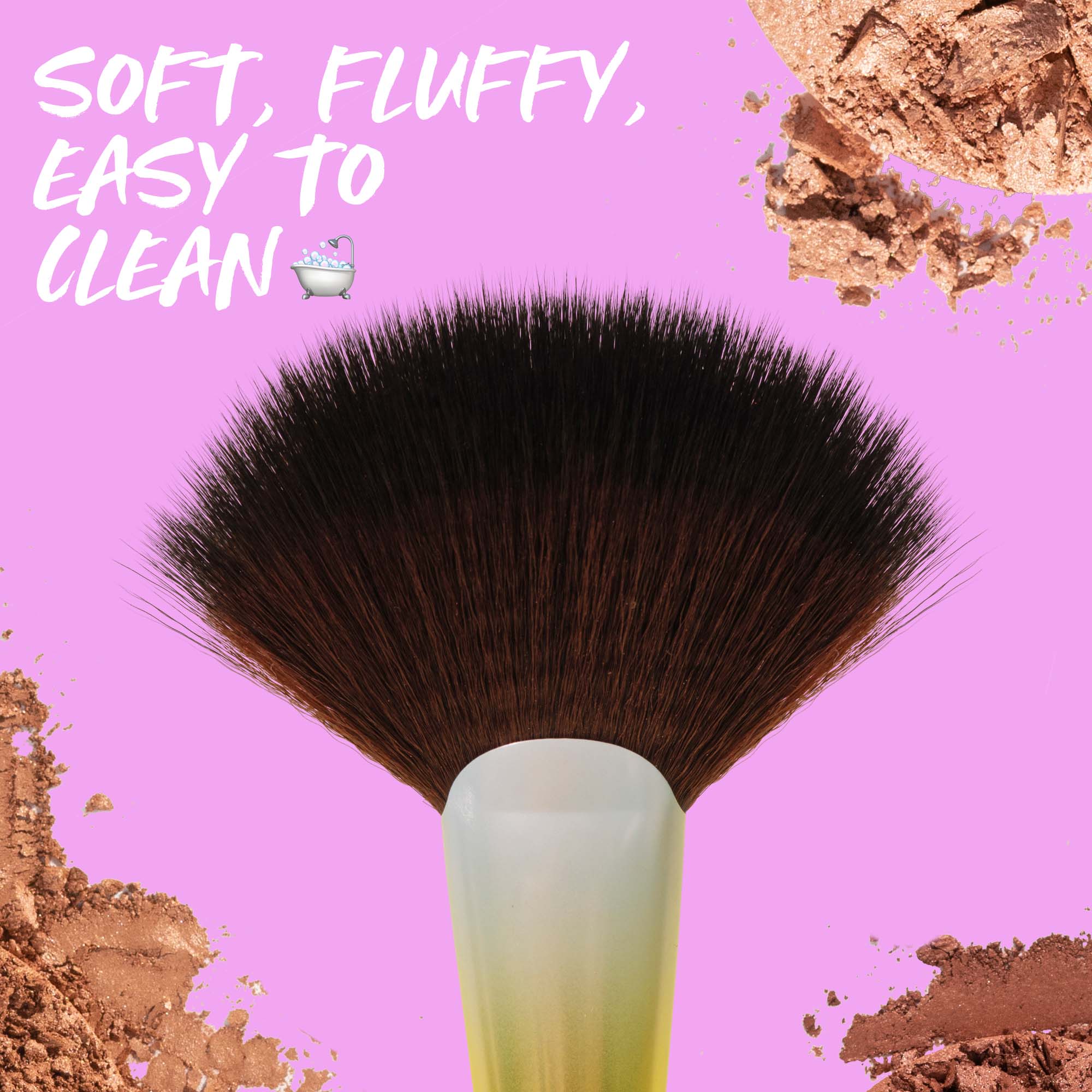 Vegan, fluffy, fan-shaped brush that sculpts and bronzes like a dream. The varying density of the bristle head creates a diffused, seamless application. The shape naturally sweeps across the face's high points—making it the ultimate bronzer brush. It blends super quick and easy for a flawless filter look.